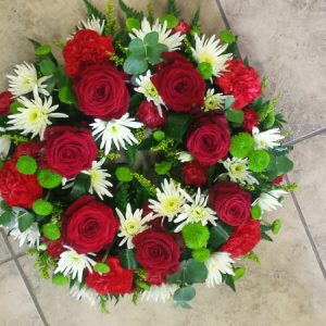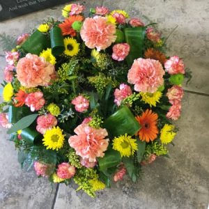 Peaceful and quiet a traditional wreath to send as a mark of respect or love. Chrysanthemums and  large headed Roses Gypsaphillia comes together  and finished with goosamer ribbon.