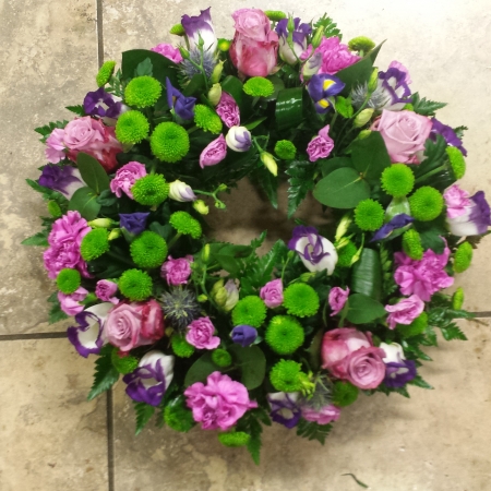 This particular wreath features, pastel cool water roses, fresh feeling green chrysanthys, purple iris, diathus in pinks, lizzanthus in purple, complimented by our freshest foliages.