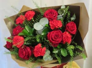 Amazing mix of Red Roses and Carnations, hand-tied by a local florist in Bracknagh, Co. Offaly.